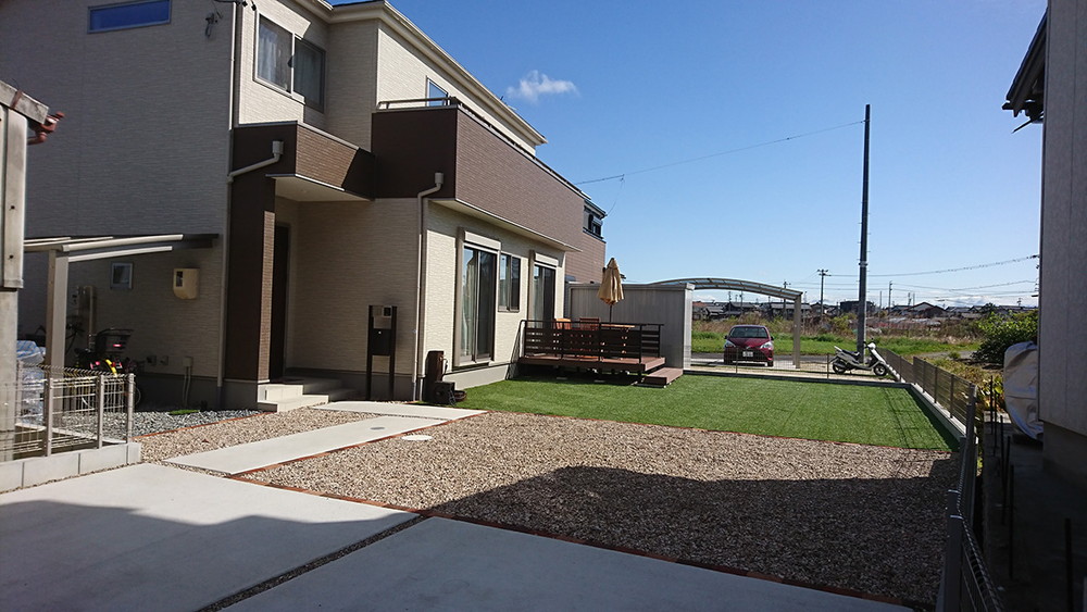 新築住宅の建築後、外構工事を施工。 駐車場・アプローチのコンクリート、砂利敷き、人工芝敷き、立水栓の設置工事を施工。